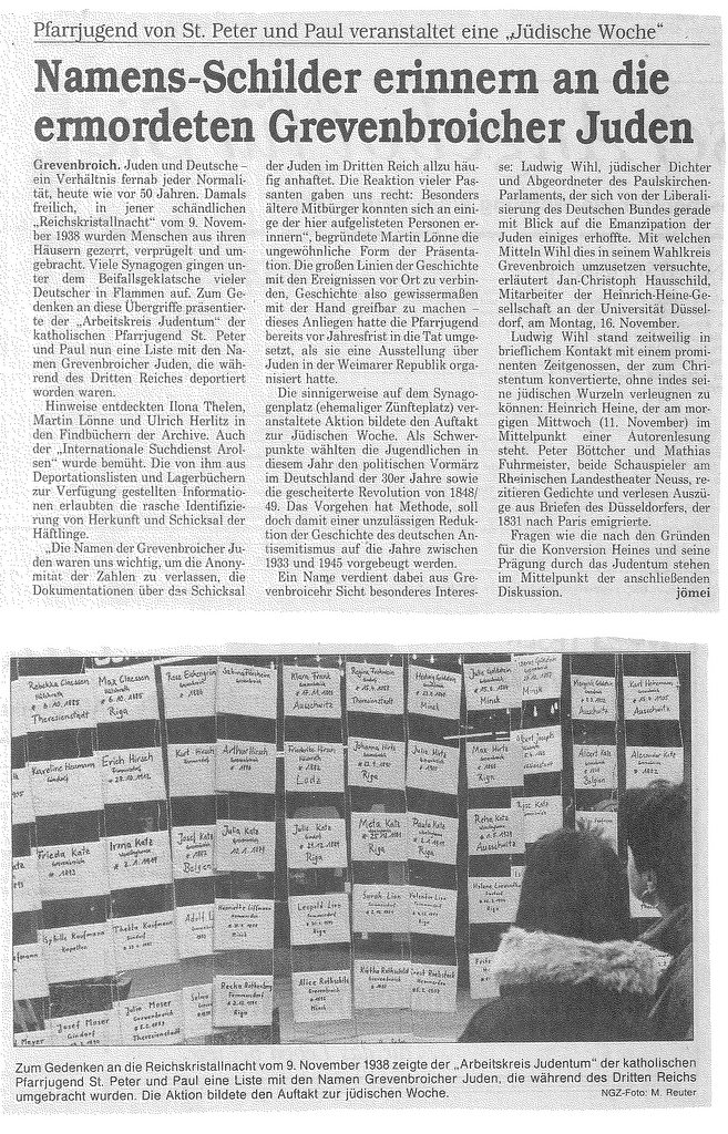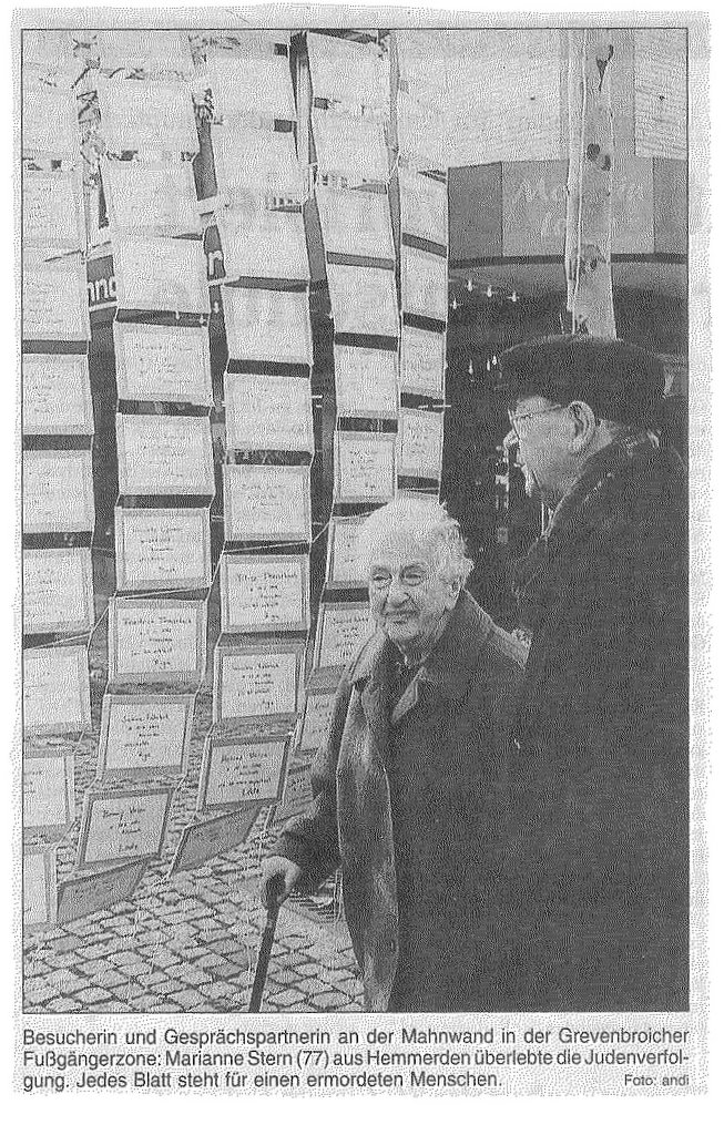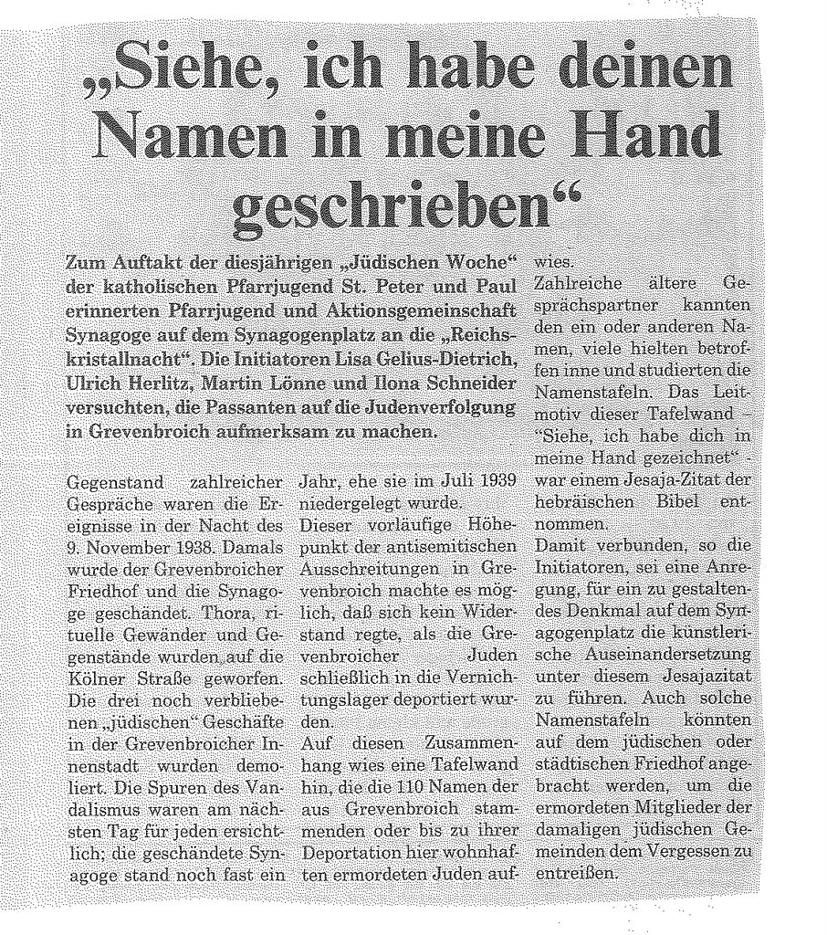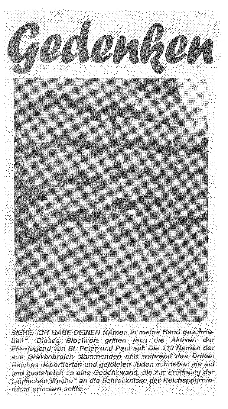 Seit 1988 erinnerten auch Schülerinnen und Schüler der Katholischen Hauptschule Stadtmitte gemeinsam mit dem Arbeitskreis Judentum der Pfarre St. Peter und Paul Grevenbroich unter dem Jesaja-Zitat "Siehe, ich habe Deinen Namen in meine Hand geschrieben!" jedes Jahr zum Gedenktag an die "Reichskristallnacht" des 9. November 1938 mit einer Namenstafelwand an die in Grevenbroich geborenen oder wohnhaft gewesenen Juden aus Grevenbroich, die im Holocaust ermordet wurden. So sollte den namenlosen Ermordeten wieder ein Name gegeben werden. Mit anwesend war immer die im Jahr 1998 verstorbene Marianne Stern, Überlebende des Holocaust aus Hemmerden, die sowohl in Schulen ging als auch die Namenstafelwand jedes Jahr besuchte.