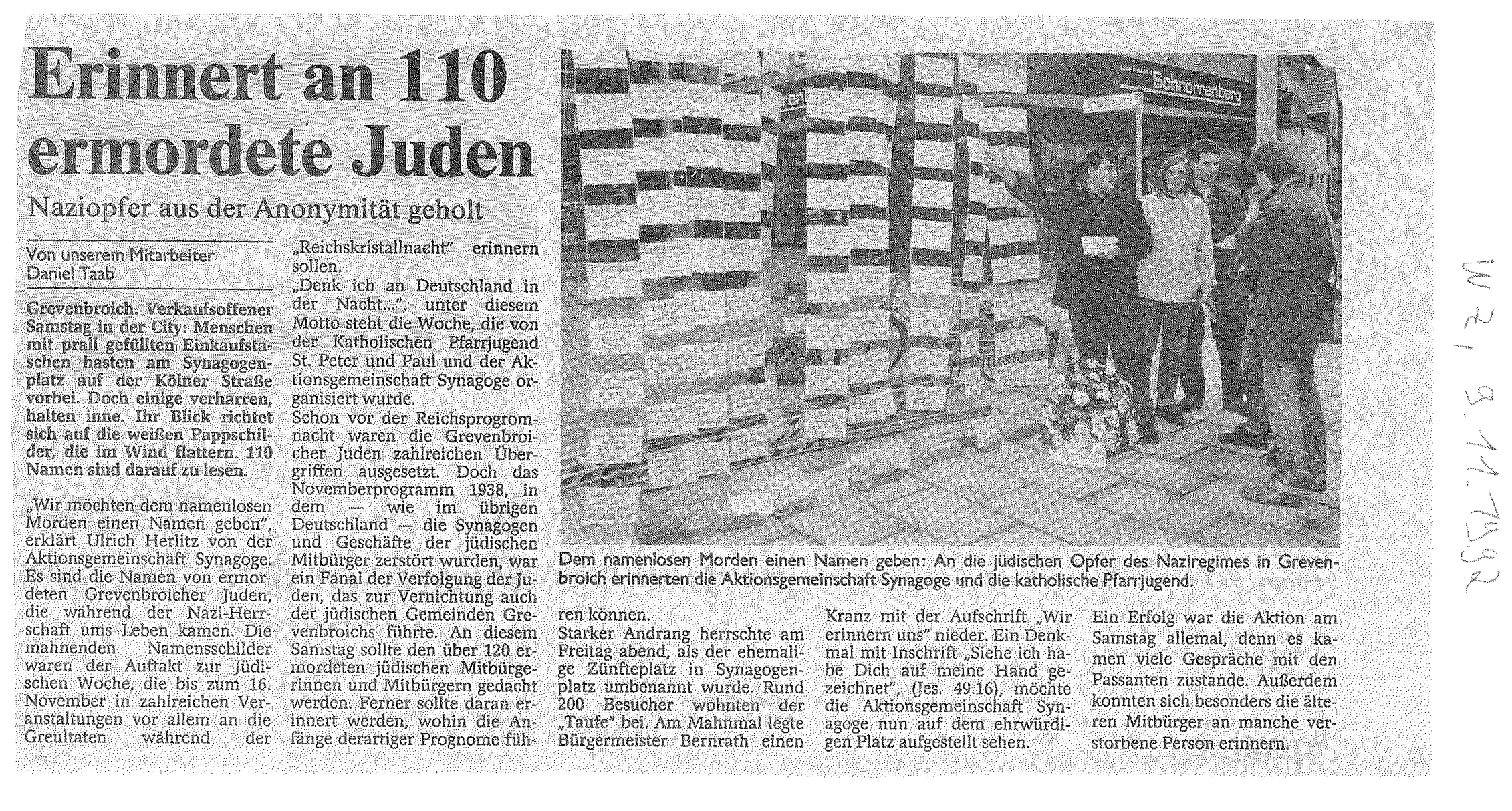 NGZ, 10.11.1992 - Namens-Schilder erinnern an die ermordeten Grevenbroicher Juden